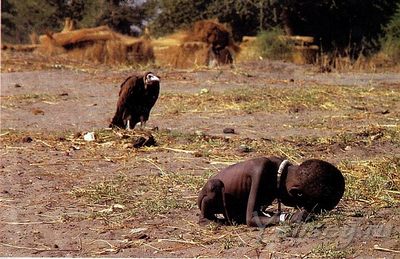 На фотографии мы видим: умирающую от голода девочку, рядом с ней стервятника который с нетерпением ждет когда ребенок умрет и станет его добычей!